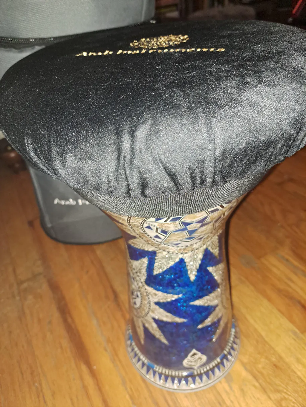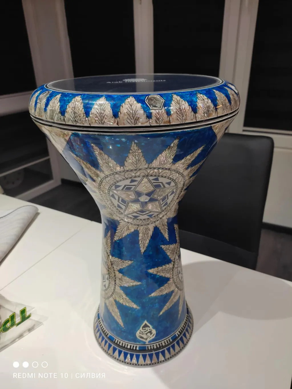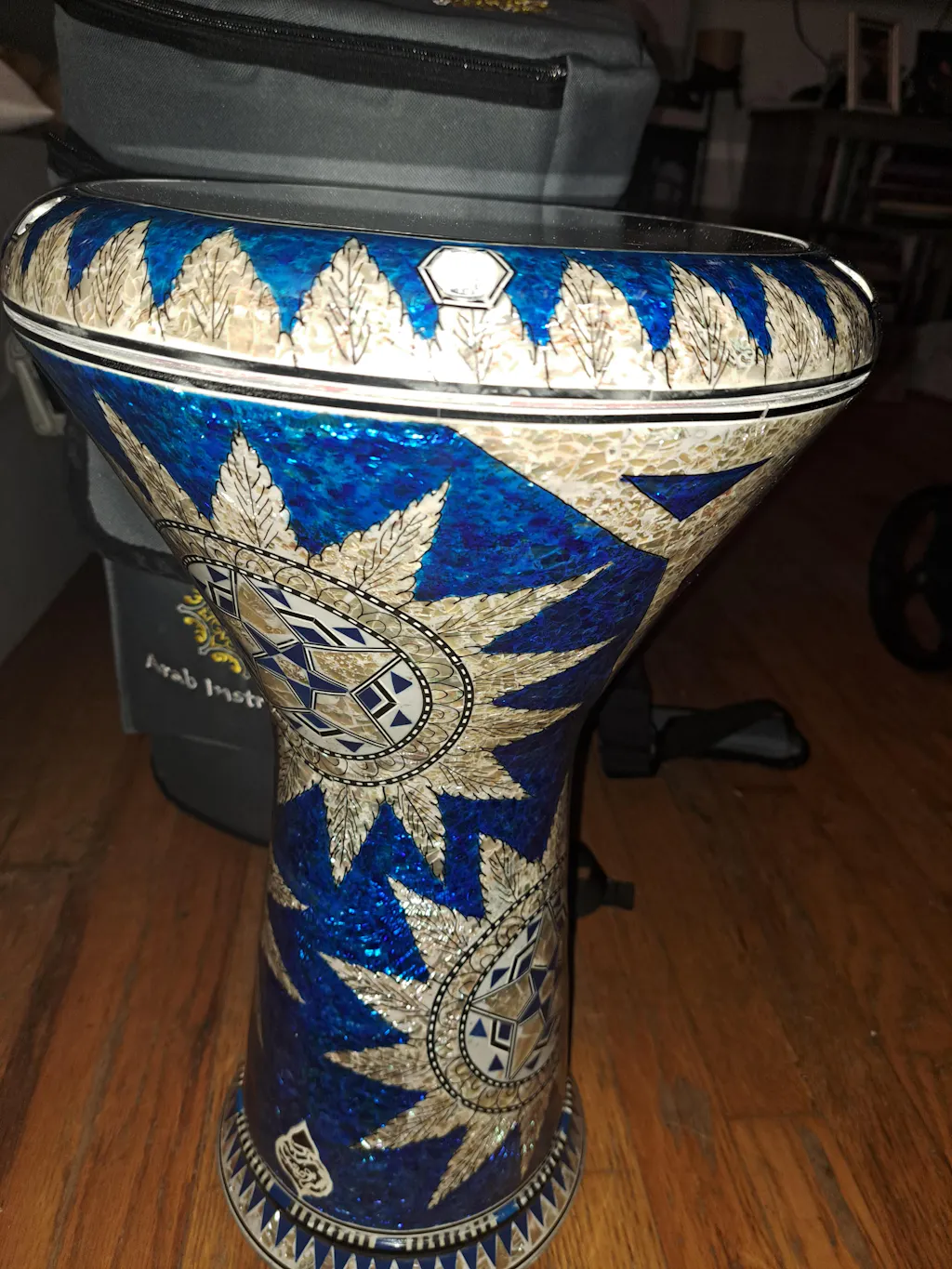 This Doumbek model is decked out with a gorgeous decoration featuring stunning mother-of-pearl and a cool Ocean blue color. With hand-painted details, it really stands out. What makes this model special is the technique used to create the mother-of-pearl design, passed down through generations from father to son. The rich heritage and careful craftsmanship make this model truly exceptional.