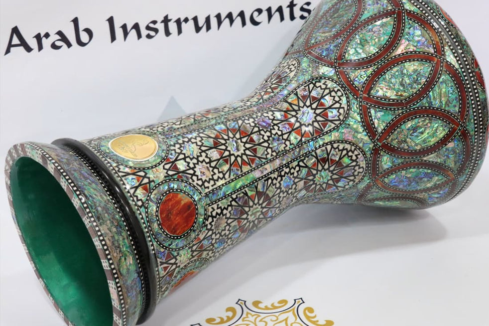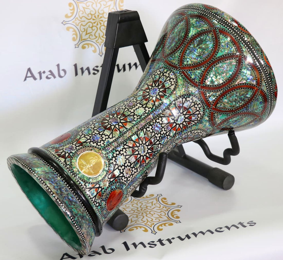 The sombaty plus darbuka made of high quality of aluminum and covers with a genuine mother of pearl which has been paste on the aluminum one by one, hand made on a traditional methods. This darbuka is a unique and one of a kind. The darbuka covers with blue and white exclusive pearlד, belongs to Arab Instruments rare collection. Building this specific darbuka with the blue pearl is a longer process and very accurate.