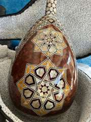 Known for his attention to detail, Mostafa Dagher ensures each oud produces a rich, authentic tone while preserving its traditional beauty. The mahogany bowl is elegantly adorned with a blend of mother-of-pearl inlays and fine woodwork, creating a stunning visual harmony. The face is further enhanced with blue pearls sourced from the shores of New Zealand and Australia, adding a natural and refined touch.