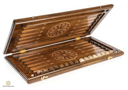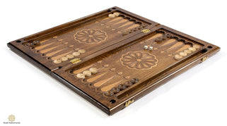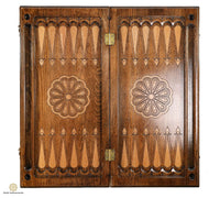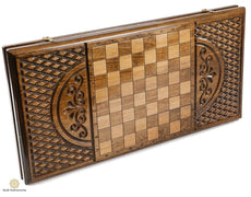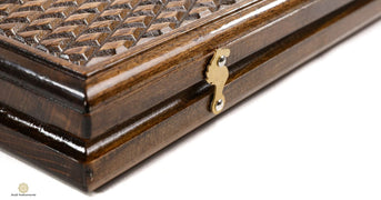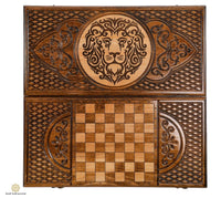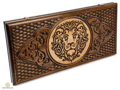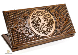 This special model made out of a premium beech wood. The other side of this premium backgammon board is designed for the game of checkers. The board Engraved with the a Lion positioned within the Armenian pictographic and coat of arm systems. This is a symbol of inspiration and courage. The all board has an amazing variety of motifs and shapes and it is completely handcrafted from bottom to top. The hinges and the locks attached to the board are made of top quality cast bronze. The set includes 32 playing pieces, made of beech and walnut wood, with velvet fabric applied to bottom of each piece, Dice made from billiards balls, Carry case with handle. Our premium Backgammon will be the most beautiful gift for every player and can be used also as a unique decoration for your apartment , fancy restaurant or exclusive club.