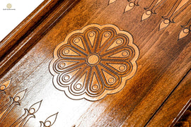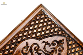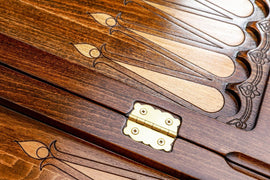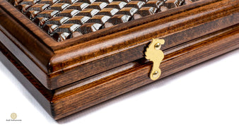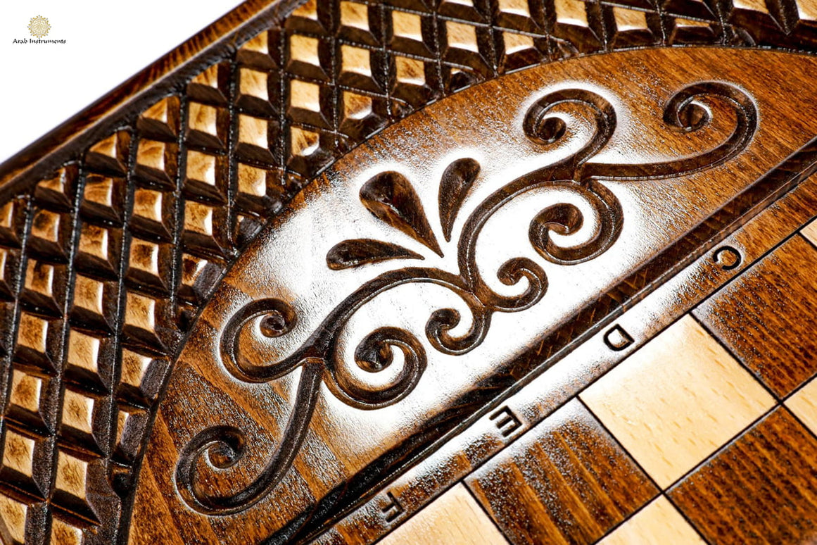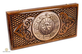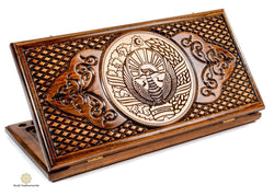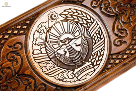 This special model made out of a premium beech wood. The other side of this premium backgammon board is designed for the game of checkers. The board Engraved with the Coat of Arms of Uzbekistan, made by a master. The all board has an amazing variety of motifs and shapes and it is completely handcrafted from bottom to top. The hinges and the locks attached to the board are made of top quality cast bronze. The set includes 32 playing pieces, made of beech and walnut wood, with velvet fabric applied to bottom of each piece, Dice made from billiards balls, Carry case with handle. Our premium Backgammon will be the most beautiful gift for every player and can be used also as a unique decoration for your apartment , fancy restaurant or exclusive club.