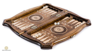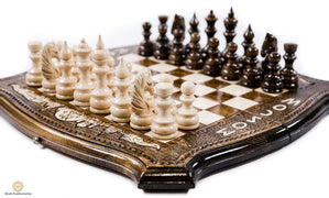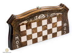 This special model made out of a premium beech wood. The board contains Chess & Backgammon games. The board Engraved with a stunning letters & Views of Moscow, made by a master. The all board has an amazing variety of motifs and shapes and it is completely handcrafted from bottom to top. The hinges and the locks attached to the board are made of top quality cast bronze. The set includes 32 chess figures, 32 playing pieces, made of beech and walnut wood, with velvet fabric applied to bottom of each piece. The Dice made from billiards balls, Branded case with wooden handle. Our premium Backgammon will be the most beautiful gift for every player and can be used also as a unique decoration for your apartment , fancy restaurant or exclusive club.