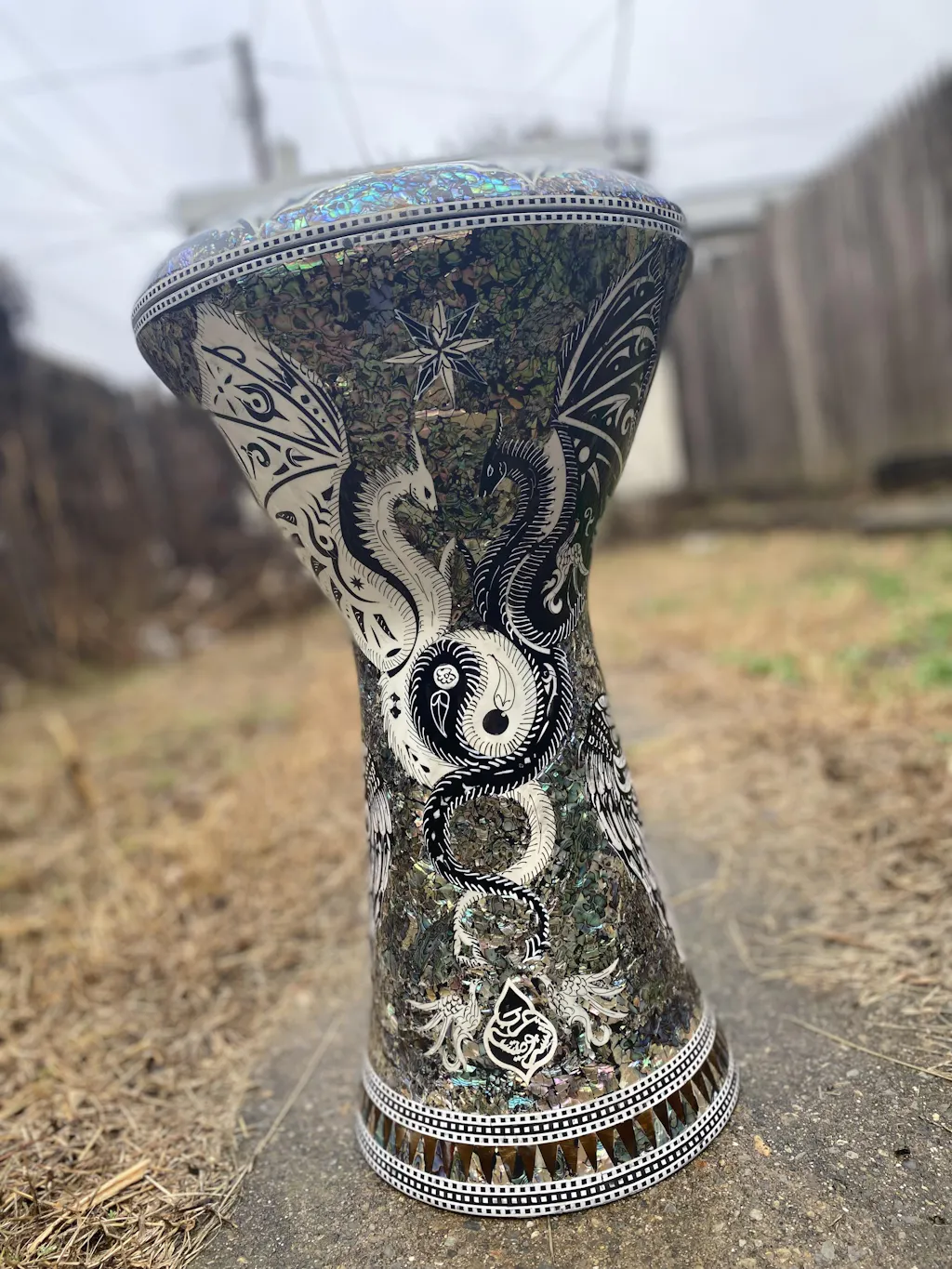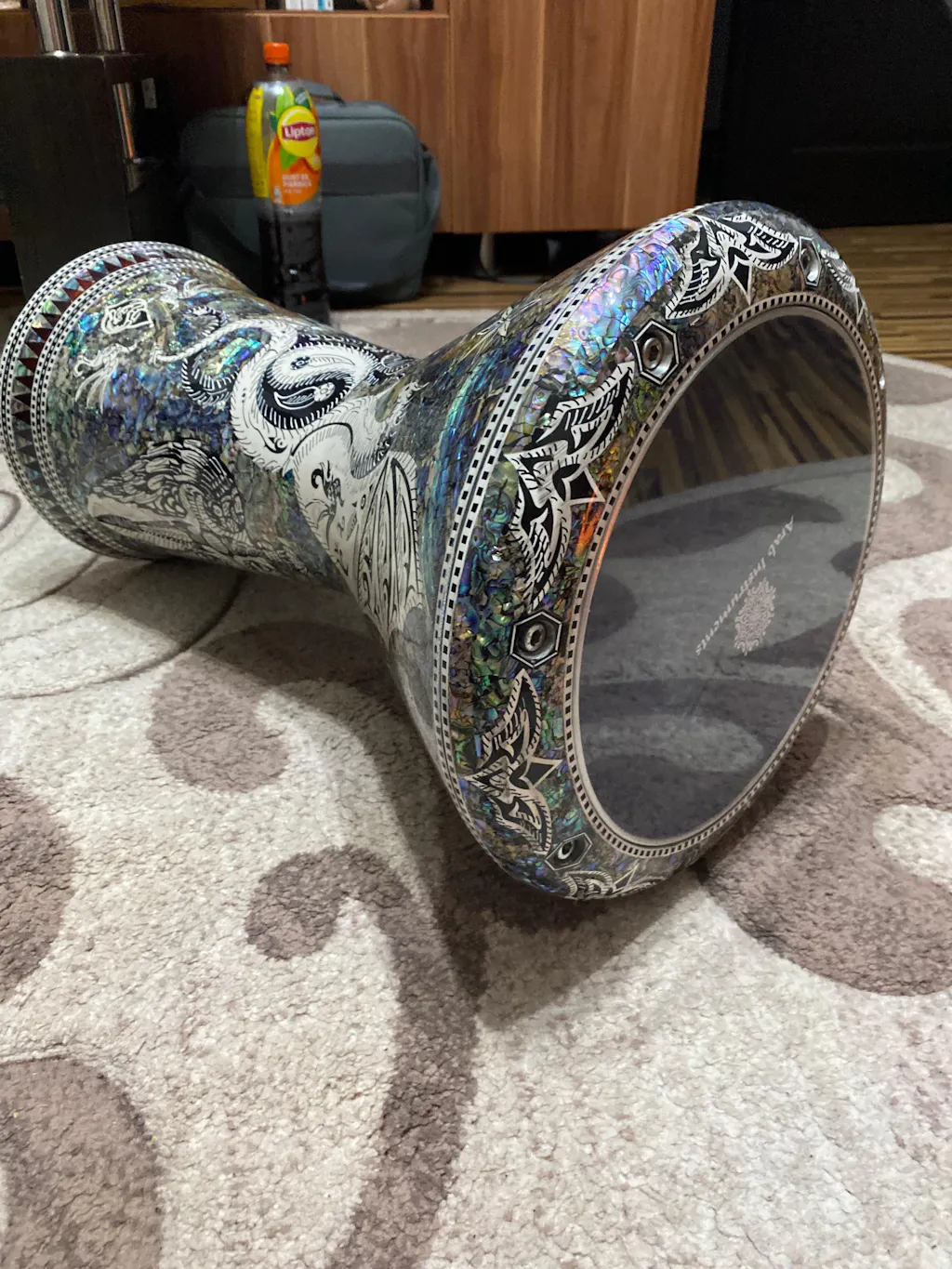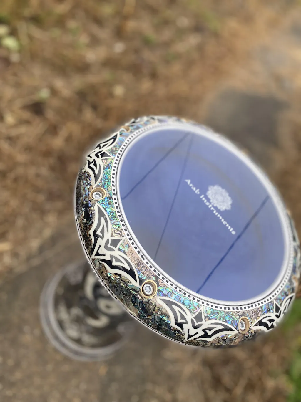 The Sombaty Plus Darbuka is carefully crafted using top-grade aluminum, ensuring high quality. Each piece is attentively adorned with genuine mother-of-pearl, thoughtfully applied by hand using traditional methods. This darbuka is absolutely unique and sets itself apart from others. It features gorgeous blue pearls sourced from the coastlines of New Zealand and Australia, adding a touch of natural beauty. What truly makes it exceptional is the striking illustration of black and white dragons, making it a highly valuable and sought-after addition to Arab Instruments' exclusive collection. You won't find another darbuka quite like this one! The construction of this special darbuka with the blue pearls involves a meticulous and precise process, resulting in its exceptional beauty and craftsmanship.