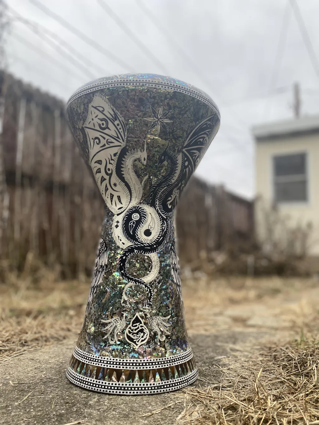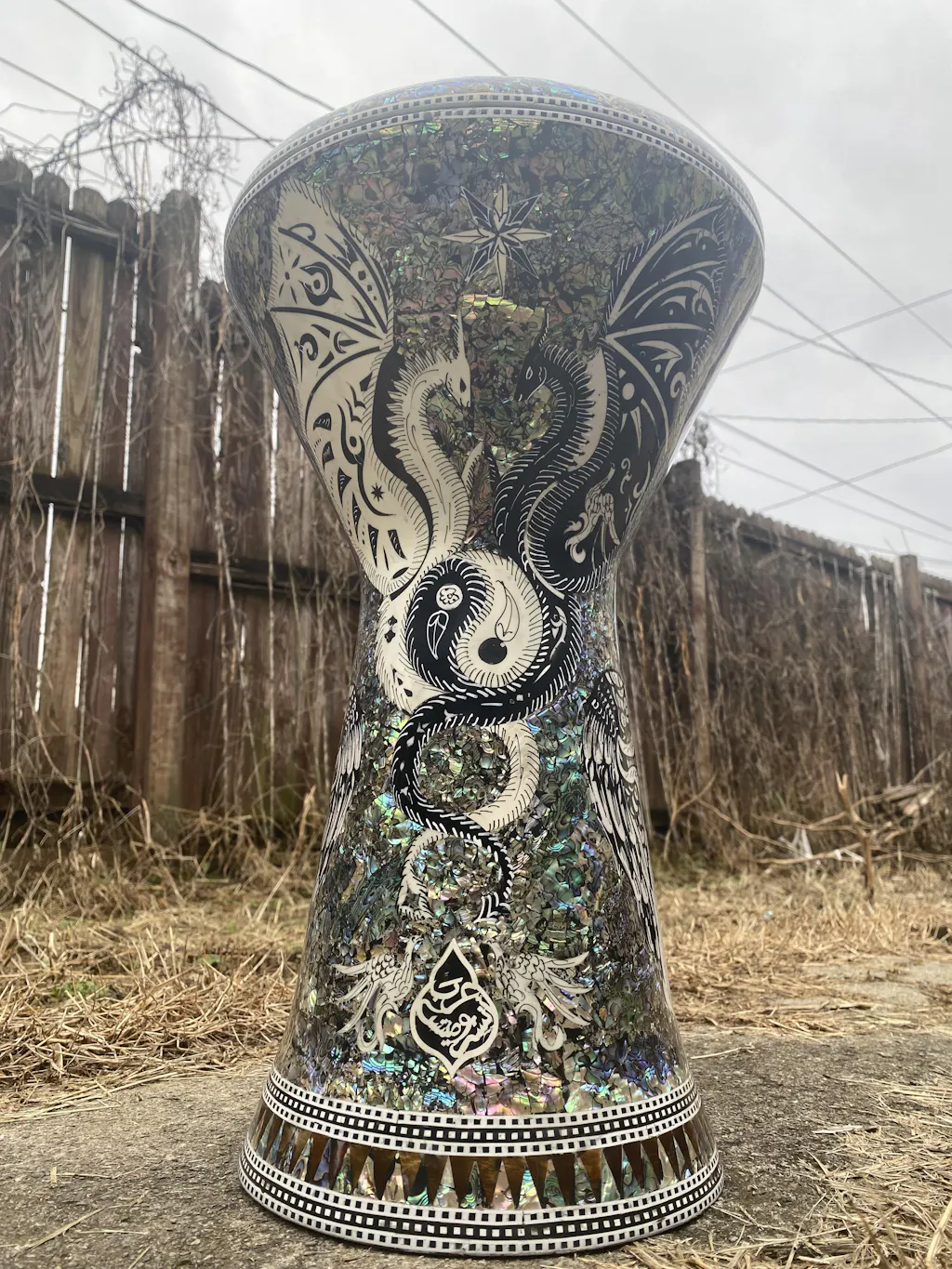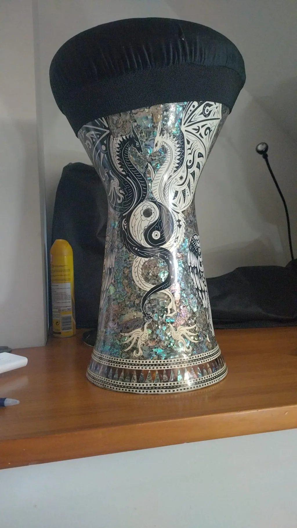 The Sombaty Plus Darbuka is carefully crafted using top-grade aluminum, ensuring high quality. Each piece is attentively adorned with genuine mother-of-pearl, thoughtfully applied by hand using traditional methods. This darbuka is absolutely unique and sets itself apart from others. It features gorgeous blue pearls sourced from the coastlines of New Zealand and Australia, adding a touch of natural beauty. What truly makes it exceptional is the striking illustration of black and white dragons, making it a highly valuable and sought-after addition to Arab Instruments' exclusive collection. You won't find another darbuka quite like this one! The construction of this special darbuka with the blue pearls involves a meticulous and precise process, resulting in its exceptional beauty and craftsmanship.
